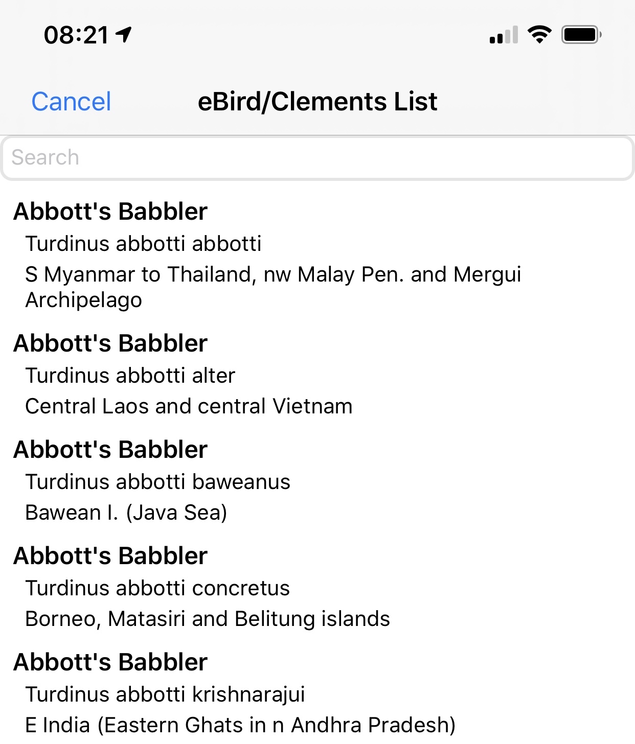 Note that for most devices the list of birds on the screen will change as you type. For older devices the list is not updated until you press Return.