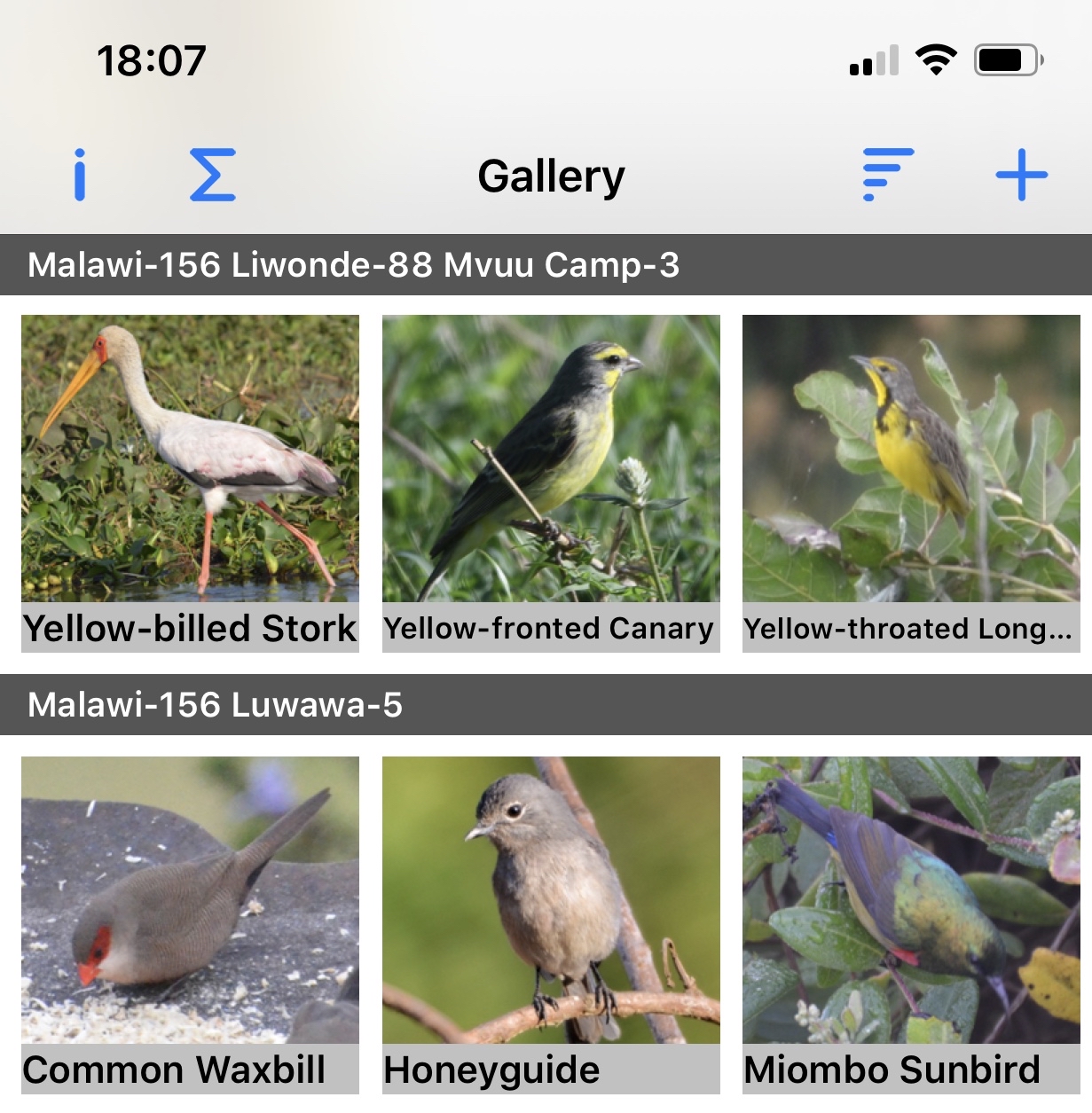 A long press on a thumbnail selects the first sighting to be shown on the Compare Birds screen. The background for the nickname will turn red, as will the Gallery title, to remind you that you are selecting sightings for comparison. Tap a second thumbnail to open the comparison screen. To clear the comparison, Tap or long press on the same bird, open the Sort Order popover or create a new entry.