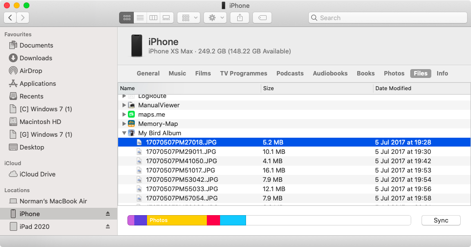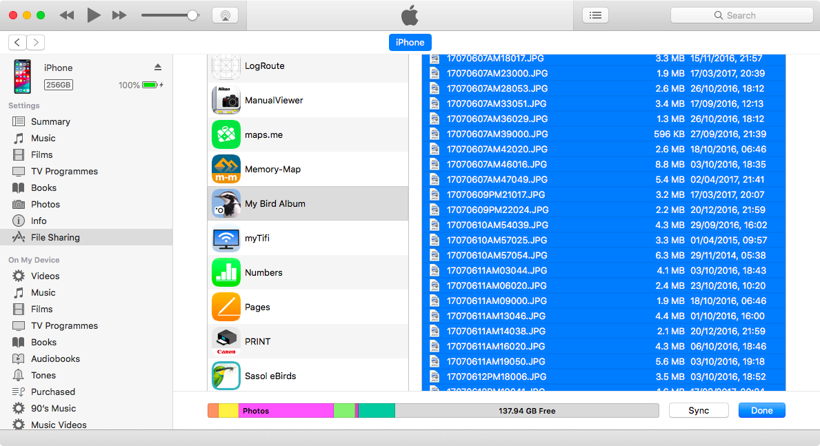 The files used by My Bird Album to store and manage your sightings can be accessed using either iTunes file sharing or The Finder. iTunes is used on Apple computers running macOS prior to Catalina and on computers running Microsoft Windows. The Finder is used on Apple computers running macOS Catalina or later.